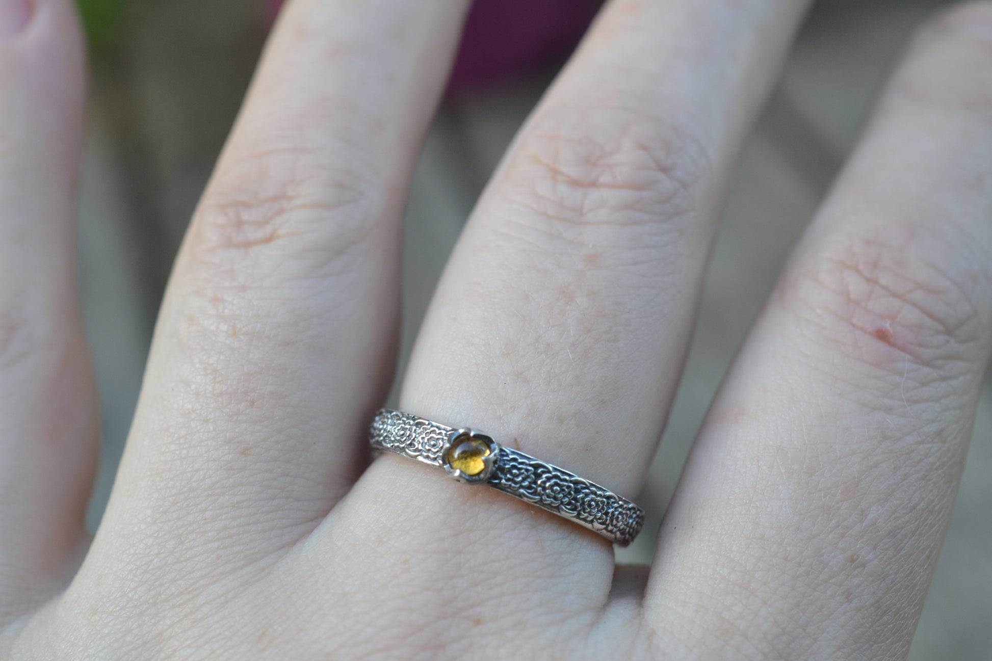 We can engrave the inside of this floral citrine stacking ring for you. You can see our font choices in the last picture. If you would like your ring personalised with engraving, just select the Yes from the drop down menu, and mention the phrase you want engraved in the 'optional note to seller' section at checkout. Please make sure your message is 20 characters or less--if you need your engraved message to be longer, please contact us first to make sure it will fit!