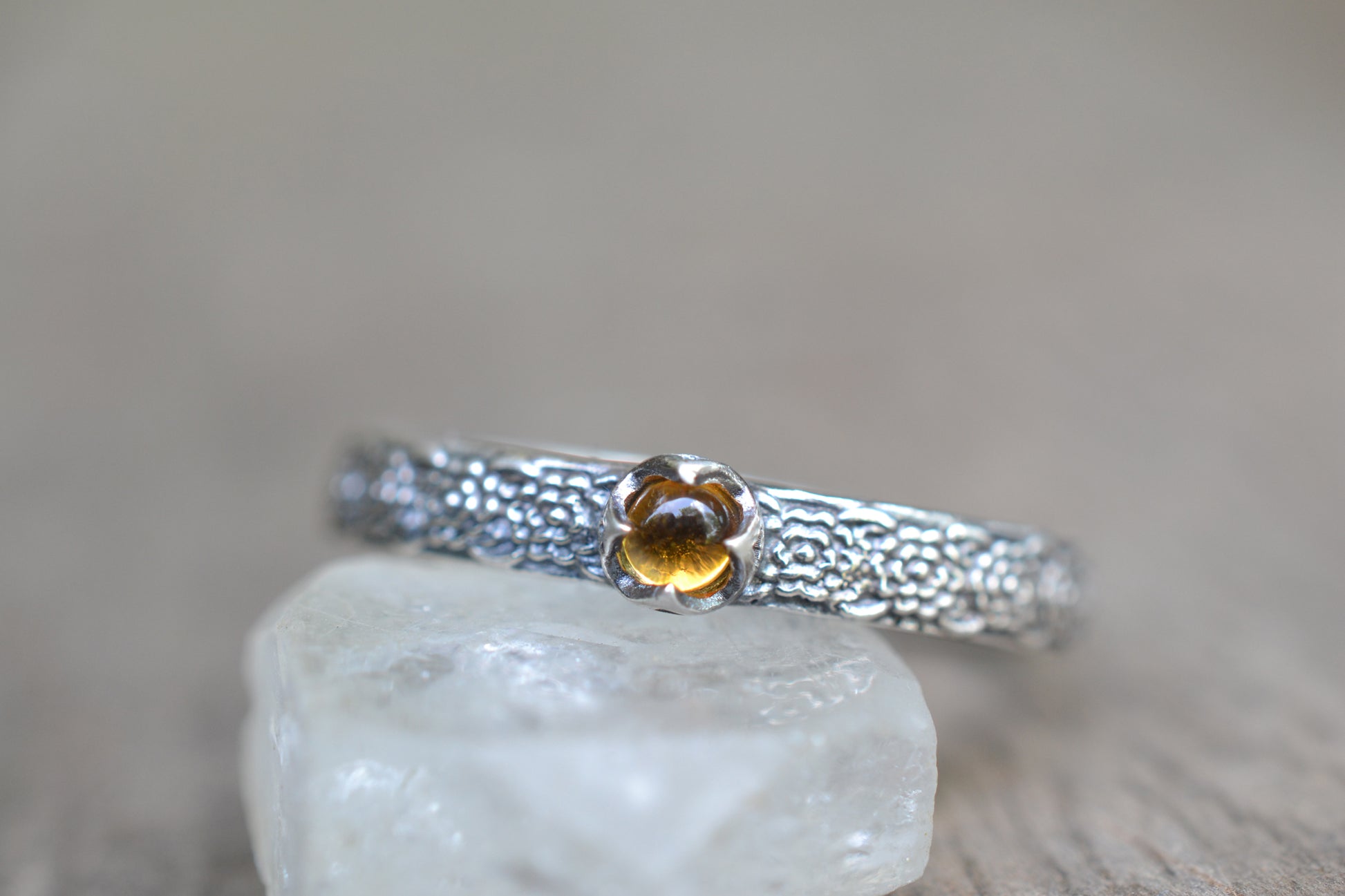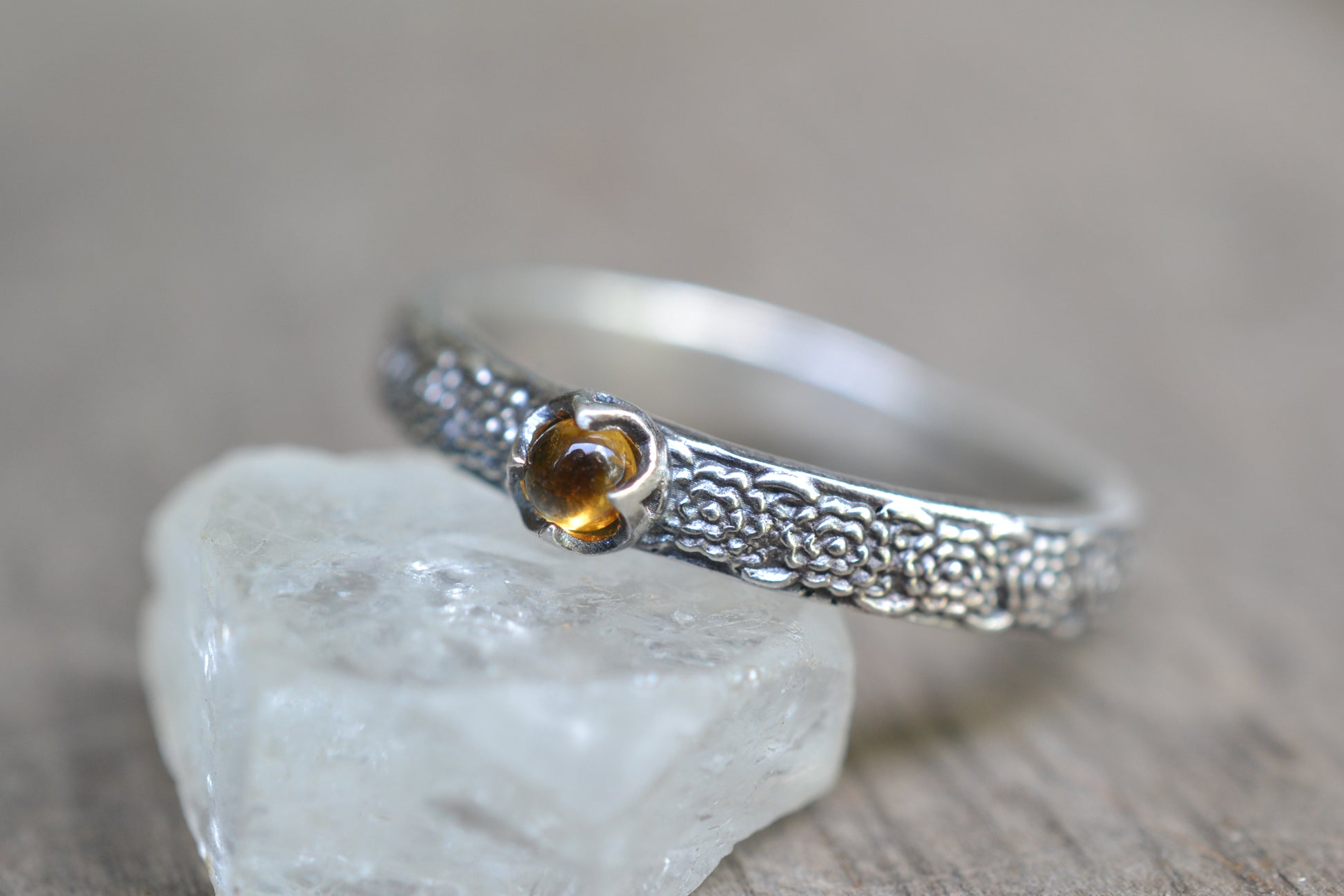 This dainty citrine moonstone ring in 925 silver will be made to order within 10-15 business days. The gemstone is a 3mm natural round orange-yellow citrine cabochon in a sterling silver petal bezel setting. The ring is entirely sterling silver, cast in recycled and reclaimed materials, with a repeating chrysanthemum flower pattern.